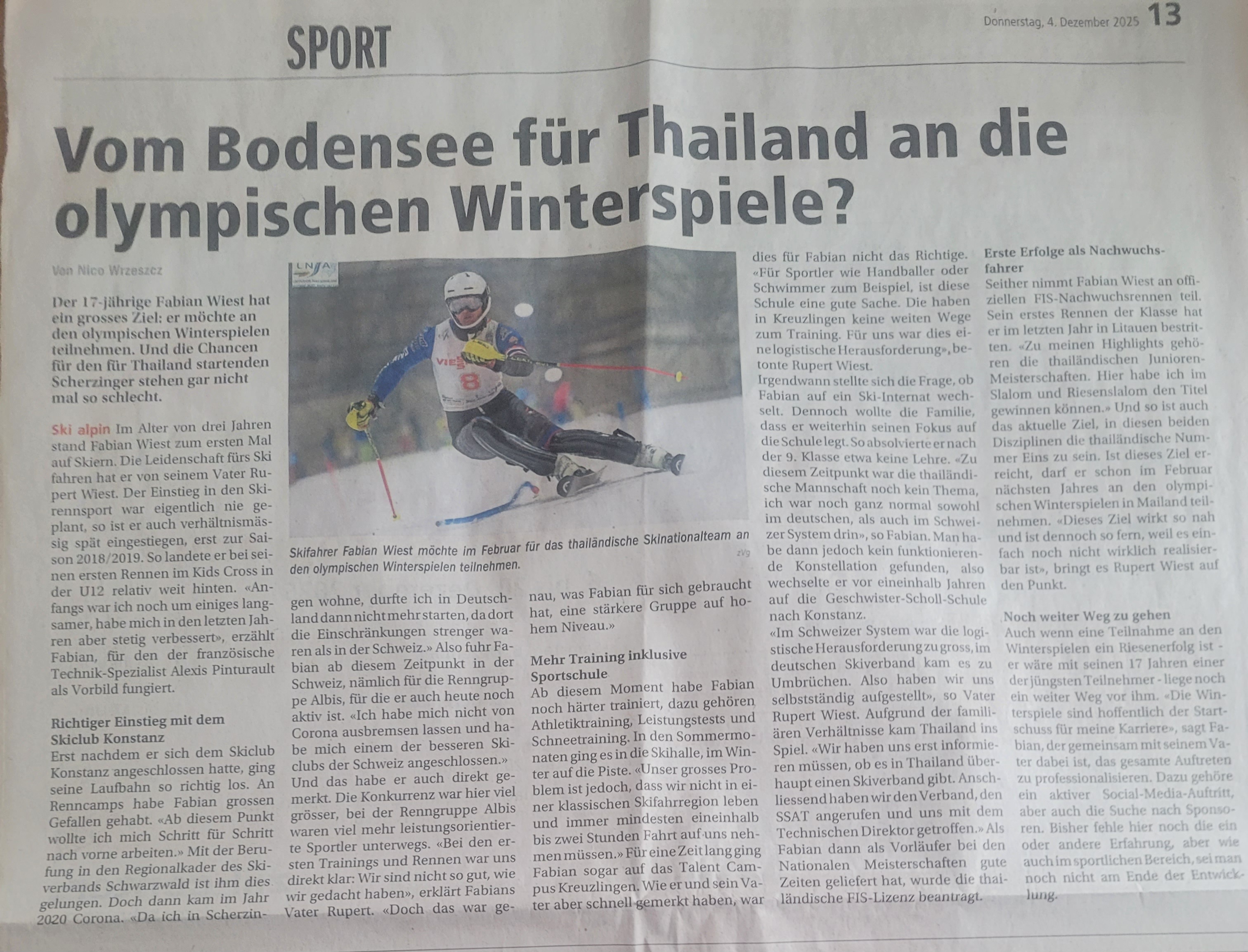 Aktuell starte ich für mein Geburtsland Thailand und für die Ski and Snowboard Association of Thailand (SSAT) bei internationalen Skirennen.